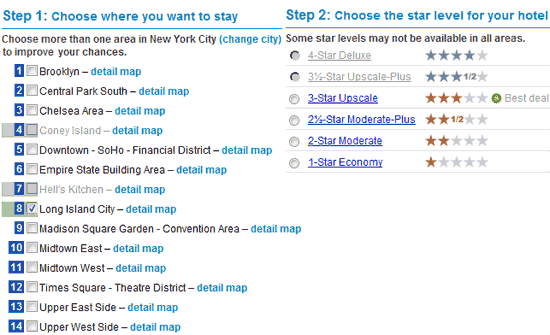 • Wenn ihr bei der Auswahl der Hotelzonen angelangt seid, klickt die erste angebotene Zone an – unabhängig davon, ob diese überhaupt für euch in Frage kommt. Überprüft nun, ob sich die zur Auswahl stehenden Sternekategorien verändert haben. Wenn Priceline in der ausgewählten Zone kein Hotel in einer bestimmten Kategorie (oder in einer besseren Kategorie) im Angebot hat, wird die entsprechende Sternekategorie nun grau dargestellt. Im nachfolgenden Beispiel verfügt Priceline beispielsweise über keine Hotels in „Long Island City“, die höher als 3-Sterne eingestuft werden: