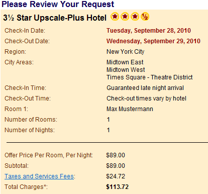 • Auf der nächsten Seite werden die ausgewählten Daten und der Gesamtpreis inkl. aller Steuern und Gebühren in US-Dollar angezeigt. Von der Möglichkeit eine „Travel Insurance“ zu buchen seht bitte ab, da diese nur für Bürger der USA gilt. Stattdessen könnt ihr nach erfolgreichem Zuschlag bei Bedarf selbst eine Reiserücktrittskosten-Versicherung abschließen (z.B. bei TravelSecure). Nachdem ihr nochmals überprüft habt, ob Name, Zimmerzahl, Sternekategorie, Region und Reisetermin korrekt sind, bestätigt die Daten durch Eingabe eurer Initialen.