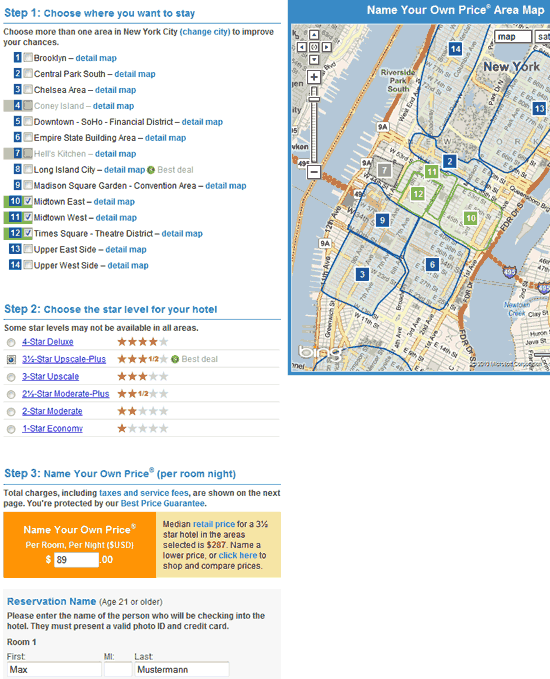pricelineDer „Name Your Own Price“-Bereich von Priceline.com stellt eine Art Hotelauktion dar, die sich vor allem in den USA großer Beliebtheit erfreut. Man wählt den gewünschten Termin, die Anzahl an Zimmern, die Hotelkategorie, den Ort des Hotels sowie einen Preisvorschlag pro Zimmer und Nacht aus. In vielen Regionen kann man die Lage des Hotels noch weiter verfeinern und sicherstellen, dass man z.B. nicht irgendwo am Stadtrand oder neben dem Flughafen landet. Nach der Auswahl der Daten und Eingabe der persönlichen Daten inkl. Kreditkartennummer ermittelt Priceline, ob ein Hotel mit den ausgewählten Eigenschaften bereit ist, für den gewählten Termin ein Zimmer für den Preisvorschlag anzubieten. War die Suche erfolgreich, wird der Name und die Anschrift des Hotels angezeigt und das Zimmer ist verbindlich gebucht und der Übernachtungspreis wird sofort über die Kreditkarte abgerechnet. Achtung: Sollte einem das Hotel nicht gefallen, hat man keine Möglichkeit, das Zimmer wieder zu stornieren. Wichtig ist daher eine sorgfältige Wahl der geografischen Zonen, der Sternezahl und des Preises, für die man bietet.